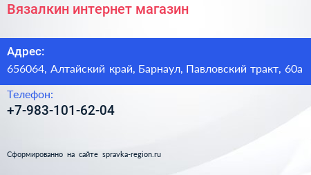 Вязалкин, интернет-магазин по адресу 656064, Алтайский край, Барнаул, Павловский тракт, 60а в дальнейшем Организация, размещена в следующих категориях: