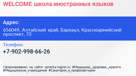 WELCOME, школа иностранных языков по адресу 656049, Алтайский край, Барнаул, Красноармейский проспект, 72 в дальнейшем Организация, размещена в следующих категориях: