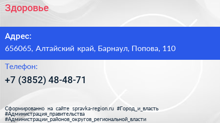 Здоровье по адресу 656065, Алтайский край, Барнаул, Попова, 110 в дальнейшем Организация, размещена в следующих категориях:
