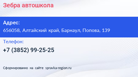 Зебра, автошкола по адресу 656058, Алтайский край, Барнаул, Попова, 139 в дальнейшем Организация, размещена в следующих категориях: