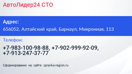 АвтоЛидер24, СТО по адресу 656052, Алтайский край, Барнаул, Микронная, 113 в дальнейшем Организация, размещена в следующих категориях:
