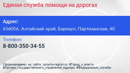 Единая служба помощи на дорогах по адресу 656056, Алтайский край, Барнаул, Партизанская, 40 в дальнейшем Организация, размещена в следующих категориях: