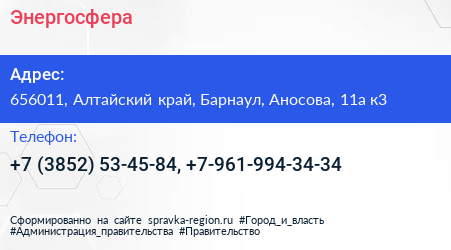 Энергосфера по адресу 656011, Алтайский край, Барнаул, Аносова, 11а к3 в дальнейшем Организация, размещена в следующих категориях: