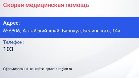 Скорая медицинская помощь по адресу 656906, Алтайский край, Барнаул, Белинского, 14а в дальнейшем Организация, размещена в следующих категориях: