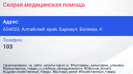 Скорая медицинская помощь по адресу 656010, Алтайский край, Барнаул, Беляева, 4 в дальнейшем Организация, размещена в следующих категориях: