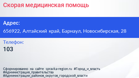 Скорая медицинская помощь по адресу 656922, Алтайский край, Барнаул, Новосибирская, 28 в дальнейшем Организация, размещена в следующих категориях: