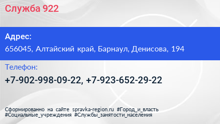 Служба-922 по адресу 656045, Алтайский край, Барнаул, Денисова, 194 в дальнейшем Организация, размещена в следующих категориях: