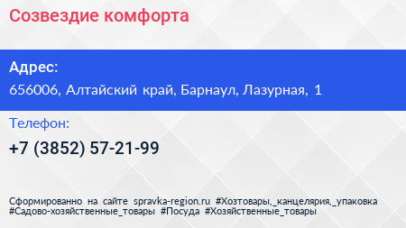 Созвездие комфорта по адресу 656006, Алтайский край, Барнаул, Лазурная, 1 в дальнейшем Организация, размещена в следующих категориях: