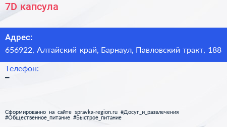 7D капсула по адресу 656922, Алтайский край, Барнаул, Павловский тракт, 188 в дальнейшем Организация, размещена в следующих категориях: