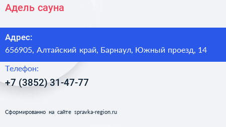 Адель, сауна по адресу 656905, Алтайский край, Барнаул, Южный проезд, 14 в дальнейшем Организация, размещена в следующих категориях: