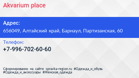 Akvarium place по адресу 656049, Алтайский край, Барнаул, Партизанская, 60 в дальнейшем Организация, размещена в следующих категориях: