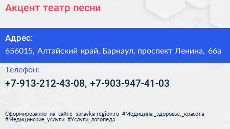 Акцент, театр песни по адресу 656015, Алтайский край, Барнаул, проспект Ленина, 66а в дальнейшем Организация, размещена в следующих категориях: