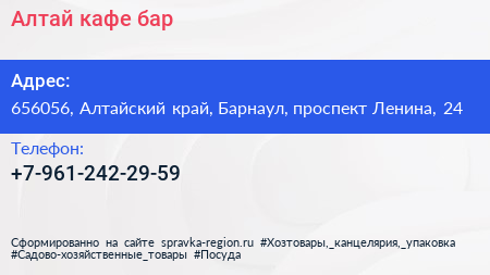 Алтай, кафе-бар по адресу 656056, Алтайский край, Барнаул, проспект Ленина, 24 в дальнейшем Организация, размещена в следующих категориях: