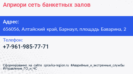 Априори, сеть банкетных залов по адресу 656056, Алтайский край, Барнаул, площадь Баварина, 2 в дальнейшем Организация, размещена в следующих категориях:
