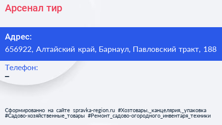 Арсенал, тир по адресу 656922, Алтайский край, Барнаул, Павловский тракт, 188 в дальнейшем Организация, размещена в следующих категориях: