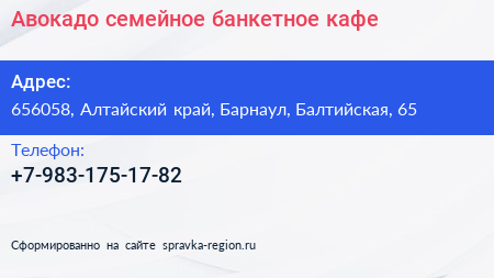 Авокадо, семейное банкетное кафе по адресу 656058, Алтайский край, Барнаул, Балтийская, 65 в дальнейшем Организация, размещена в следующих категориях: