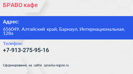 БРАВО, кафе по адресу 656049, Алтайский край, Барнаул, Интернациональная, 128а в дальнейшем Организация, размещена в следующих категориях: