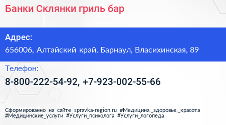 Банки-Склянки, гриль-бар по адресу 656006, Алтайский край, Барнаул, Власихинская, 89 в дальнейшем Организация, размещена в следующих категориях: