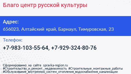 Благо, центр русской культуры по адресу 656023, Алтайский край, Барнаул, Тимуровская, 23 в дальнейшем Организация, размещена в следующих категориях: