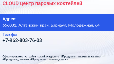 CLOUD, центр паровых коктейлей по адресу 656031, Алтайский край, Барнаул, Молодёжная, 64 в дальнейшем Организация, размещена в следующих категориях: