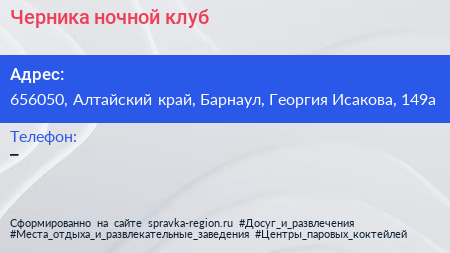 Черника, ночной клуб по адресу 656050, Алтайский край, Барнаул, Георгия Исакова, 149а в дальнейшем Организация, размещена в следующих категориях: