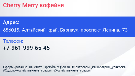 Cherry Merry, кофейня по адресу 656015, Алтайский край, Барнаул, проспект Ленина, 73 в дальнейшем Организация, размещена в следующих категориях: