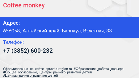 Coffee monkey по адресу 656058, Алтайский край, Барнаул, Взлётная, 33 в дальнейшем Организация, размещена в следующих категориях: