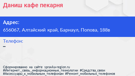 Даниш, кафе-пекарня по адресу 656067, Алтайский край, Барнаул, Попова, 188в в дальнейшем Организация, размещена в следующих категориях: