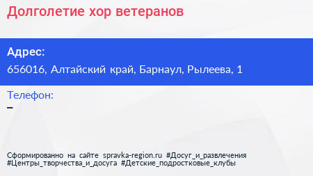 Долголетие, хор ветеранов по адресу 656016, Алтайский край, Барнаул, Рылеева, 1 в дальнейшем Организация, размещена в следующих категориях: