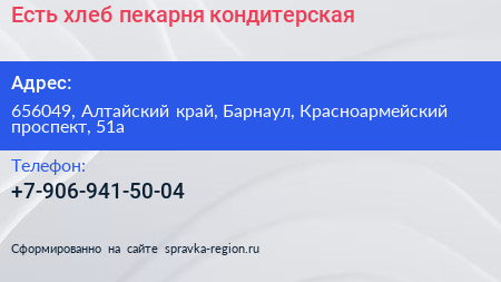 Есть хлеб, пекарня-кондитерская по адресу 656049, Алтайский край, Барнаул, Красноармейский проспект, 51а в дальнейшем Организация, размещена в следующих категориях: