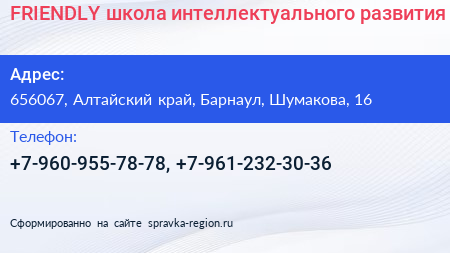 FRIENDLY, школа интеллектуального развития по адресу 656067, Алтайский край, Барнаул, Шумакова, 16 в дальнейшем Организация, размещена в следующих категориях: