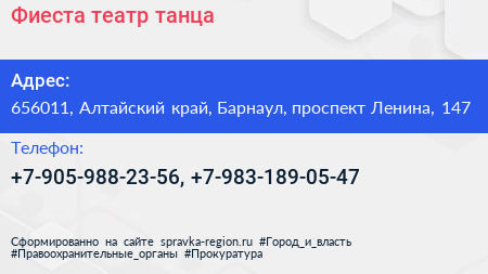 Фиеста, театр танца по адресу 656011, Алтайский край, Барнаул, проспект Ленина, 147 в дальнейшем Организация, размещена в следующих категориях: