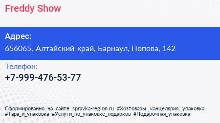 Freddy Show по адресу 656065, Алтайский край, Барнаул, Попова, 142 в дальнейшем Организация, размещена в следующих категориях:
