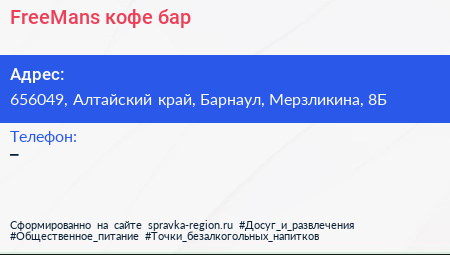 FreeMans, кофе-бар по адресу 656049, Алтайский край, Барнаул, Мерзликина, 8Б в дальнейшем Организация, размещена в следующих категориях: