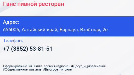 Ганс, пивной ресторан по адресу 656006, Алтайский край, Барнаул, Взлётная, 2е в дальнейшем Организация, размещена в следующих категориях: