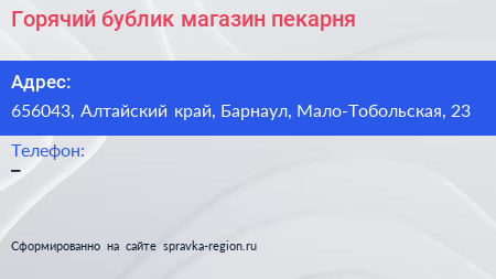 Горячий бублик, магазин-пекарня по адресу 656043, Алтайский край, Барнаул, Мало-Тобольская, 23 в дальнейшем Организация, размещена в следующих категориях: