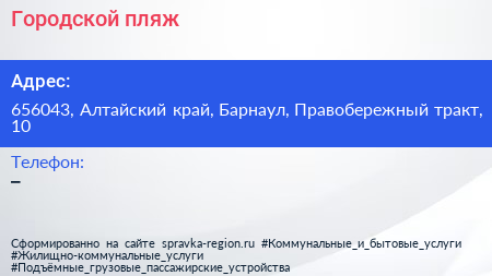 Городской пляж по адресу 656043, Алтайский край, Барнаул, Правобережный тракт, 10 в дальнейшем Организация, размещена в следующих категориях: