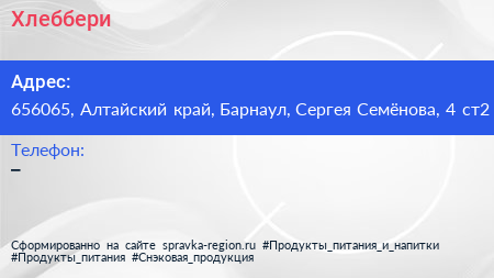 Хлеббери по адресу 656065, Алтайский край, Барнаул, Сергея Семёнова, 4 ст2 в дальнейшем Организация, размещена в следующих категориях: