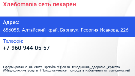 Хлебоmania, сеть пекарен по адресу 656055, Алтайский край, Барнаул, Георгия Исакова, 226 в дальнейшем Организация, размещена в следующих категориях: