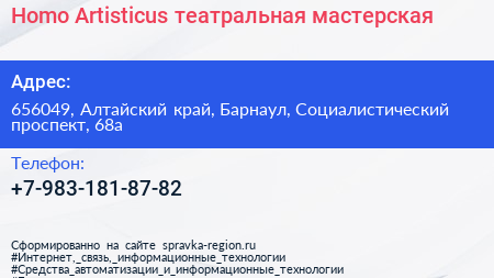 Homo Artisticus, театральная мастерская по адресу 656049, Алтайский край, Барнаул, Социалистический проспект, 68а в дальнейшем Организация, размещена в следующих категориях: