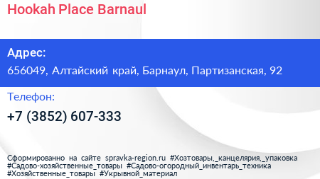 Hookah Place Barnaul по адресу 656049, Алтайский край, Барнаул, Партизанская, 92 в дальнейшем Организация, размещена в следующих категориях: