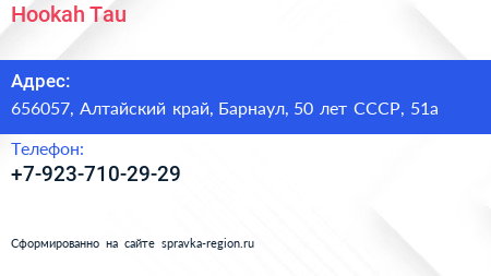 Hookah Tau по адресу 656057, Алтайский край, Барнаул, 50 лет СССР, 51а в дальнейшем Организация, размещена в следующих категориях: