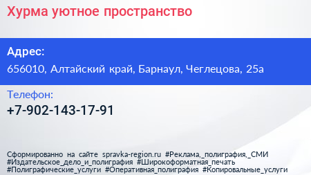 Хурма, уютное пространство по адресу 656010, Алтайский край, Барнаул, Чеглецова, 25а в дальнейшем Организация, размещена в следующих категориях: