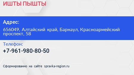 ИШТЫ-ПЫШТЫ по адресу 656049, Алтайский край, Барнаул, Красноармейский проспект, 58 в дальнейшем Организация, размещена в следующих категориях: