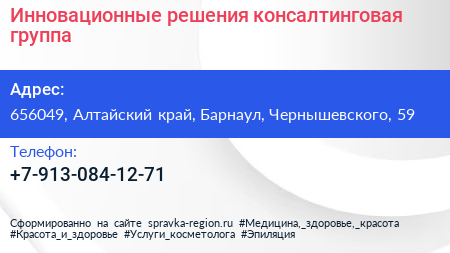 Инновационные решения, консалтинговая группа по адресу 656049, Алтайский край, Барнаул, Чернышевского, 59 в дальнейшем Организация, размещена в следующих категориях: