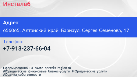 Инсталаб по адресу 656065, Алтайский край, Барнаул, Сергея Семёнова, 17 в дальнейшем Организация, размещена в следующих категориях: