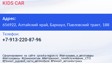 KIDS CAR по адресу 656922, Алтайский край, Барнаул, Павловский тракт, 188 в дальнейшем Организация, размещена в следующих категориях:
