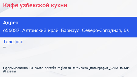 Кафе узбекской кухни по адресу 656037, Алтайский край, Барнаул, Северо-Западная, 6в в дальнейшем Организация, размещена в следующих категориях: