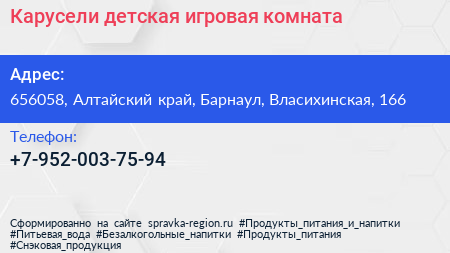 Карусели, детская игровая комната по адресу 656058, Алтайский край, Барнаул, Власихинская, 166 в дальнейшем Организация, размещена в следующих категориях: