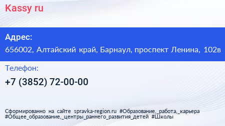 Kassy.ru по адресу 656002, Алтайский край, Барнаул, проспект Ленина, 102в в дальнейшем Организация, размещена в следующих категориях: